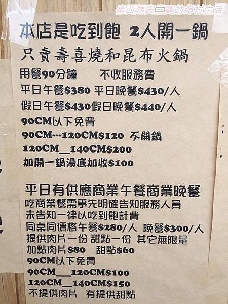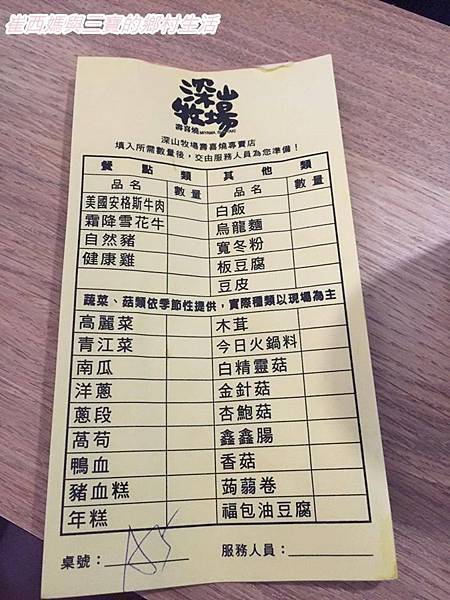 深山牧場有昆布火鍋和壽喜燒兩種選擇,若食量較小的人也有商業午餐(280/人)或是商業晚餐(300/人),內容是肉片一份(霜降牛、安格斯牛、健康豬、自然雞則ㄧ)、甜點一份和自助區的時蔬和飲料,但只限平日喔!